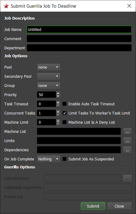 You can submit jobs from within Guerilla by installing the integrated submission script, or you can submit them from the Monitor. The instructions for installing the integrated submission script can be found further down this page.