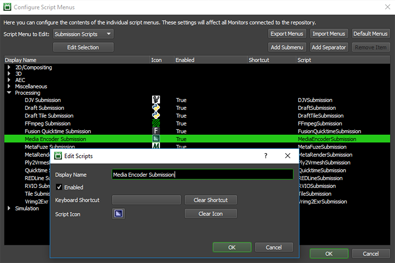 There are many scripts that ship with Deadline, and it’s more than likely that you don’t need to use them all, especially the submission scripts. Via Monitor -> Super User Mode -> Tools -> Configure Script Menus, you can configure the contents of the individual script menus to only display what you use. You can also set icons and keyboard shortcuts for your script menu items. If a script menu item has the same shortcut as an existing menu item, the script menu item’s shortcut will take precedence.